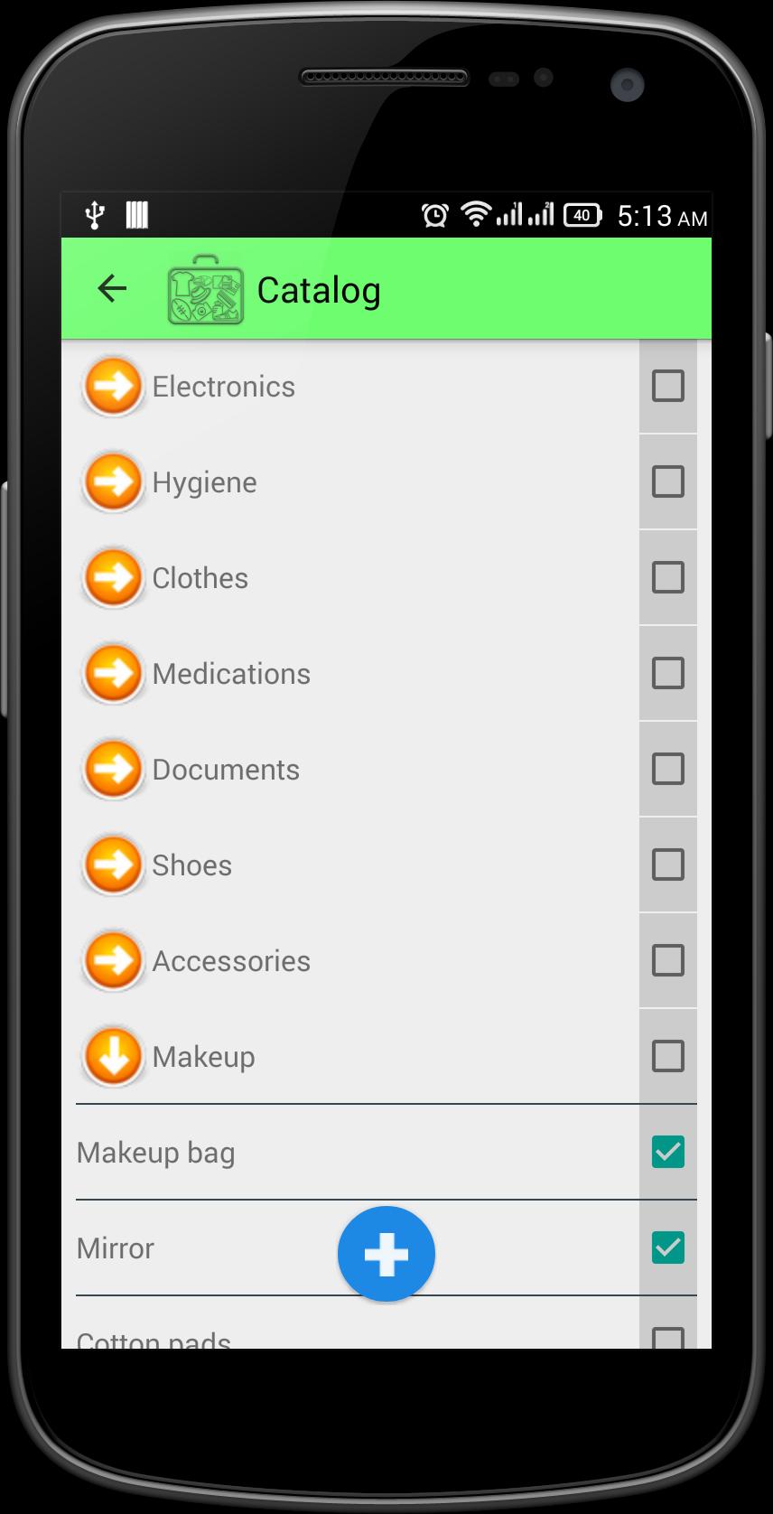 • In der App befindet sich ein Beispielkatalog von Elementen, mit dem eine Packliste erstellt wird.